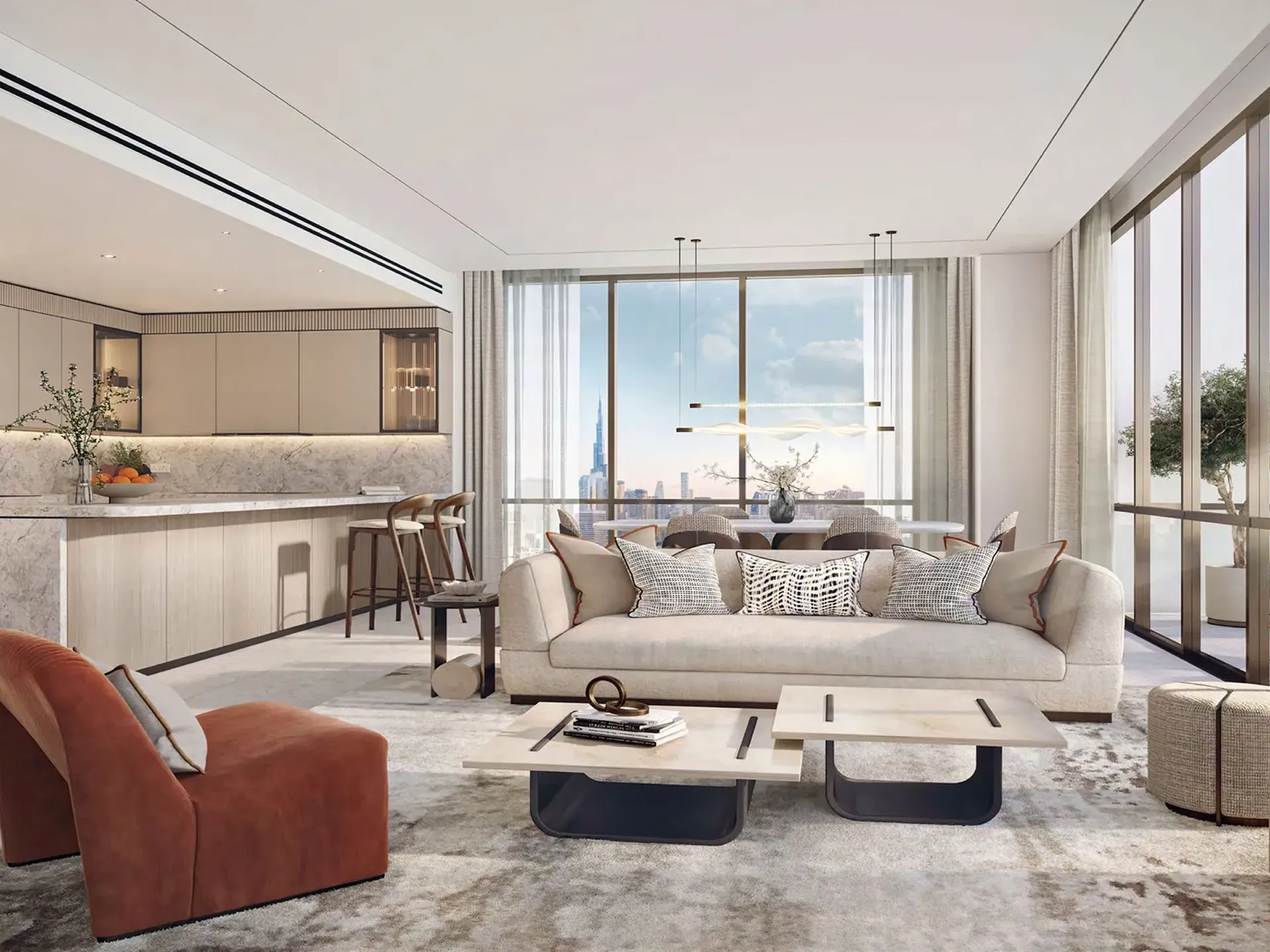 The project offers an array of residences: 1- to 4-bedroom apartments, 4-bedroom sky villas, and lavish 5-bedroom penthouses. Each unit is crafted with care—open-plan layouts, floor-to-ceiling windows, generous private terraces or balconies, and premium finishes throughout. For those seeking extra vertical extravagance, the sky villas feature double-height living areas, sculptural staircases, and breathtaking views.